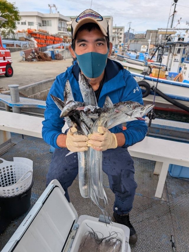 竿頭41匹 若潮。 ご乗船いただいた皆様、長旅お疲れ様でございます。 <タチウオ洲本遠征便> ◾️ジグ◾️ TOP32本、 2番手20本。 ◾️テンヤ◾️ TOP41本✖️2名様、 3番手40本、 20本〜30本位のお客様が多かったです。 秋晴れのよいお天気でした。 寒くなってきましたので、防寒対策の準備をお願いします。 また個人生簀から水が流れるので、長靴や防水の靴等を履いてお越しください。 朝からタチウオの活性高く、船中あちらこちらでロッドが曲がりました。 ひと流し目に116.5cmの準ドラゴンがあがりました。 釣られたお客様、一本勝負暫定2位お見事でございます。 最後の流しで尾切れドラゴン? 尾があれば……。 またまた洲本ドラゴンはお預けとなりました。 終了まで釣れ続き、船中満遍なく釣れていたのでよかったです。 本日は最後まで頑張っていただきありがとうございました。 長旅の道中、お身体冷えたと思いますので、お風呂等でゆっくり温もって風邪などひかれない様にされてください。 またの御乗船、心よりお待ちしております。