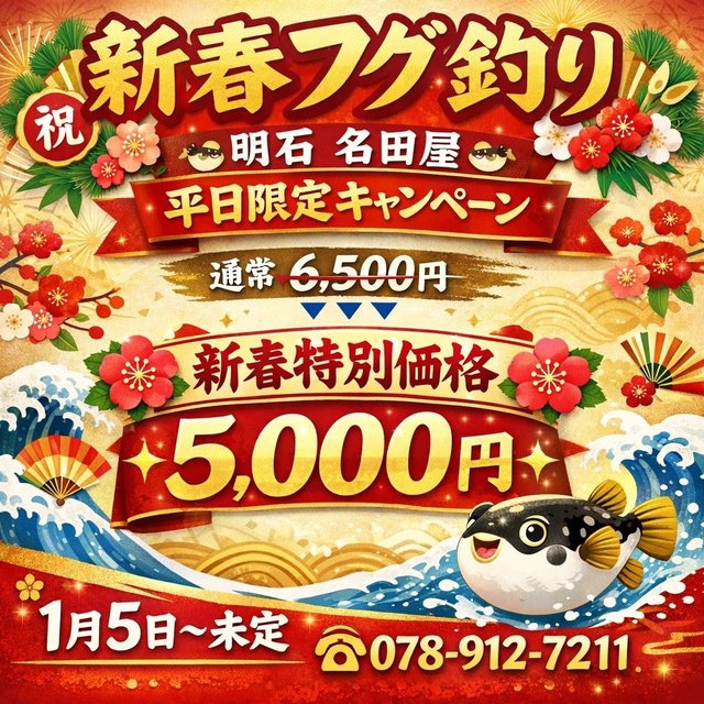 ★新年あけましておめでとうございます★本日より名田屋、出船しております!昨年もたくさんのご乗船、誠にありがとうございました!本年も楽しく、皆さまに喜んでいただけるよう働いて!働いて!働いてまいります!よろしくお願いいたします!さて、新年早々の目玉企画→★新春フグ釣り【平日限定】キャンペーン★通常6,500円のところ新春特別価格【5,000円】!!ですが・・・「安い=短時間」ではありません。釣行時間はいつも通りたっぷりと!内容は通常便と変わりません◎時間そのまま◎釣りもそのまま◎料金だけ新春価格!いつもお越しくださる方も、初めてお越しの方も、お久しぶりの方も【全員が新春価格の対象です!】★無料駐車場完備