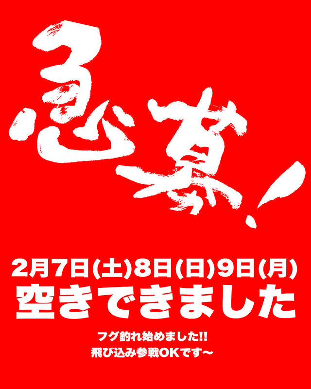 21~35cm 合計27匹 2月13日金曜日、 暖かくなった途端、とんでもない釣果が出ました。 トップ27匹、15匹。デカフグだらけ。 4名で船中50匹超え、そこからは数えていません。 止まらない釣果。 前半は厳しかったですが、後半の上げの動き出しから荒食い状態に入りました。 船により差はありましたが、凄い1日でした。 皆様、本日はありがとうございました。 明日からも期待大です。 今週は土日もまだ少し空きがあります。 最新スケジュールを更新いたします。 ―――――――――― ■2月14日(土) ・フグタイラバ1日便募集中 ・ガシラ便予定(人数が揃えば出船) ・一つテンヤ2名のみ空き ・フグ1日便残り4名 ・フグ通常便空きあり ■2月15日(日) ・フグタイラバ1日便募集中 ・タイラバ便募集中 ・フグ1日便残り5名 ・フグ通常便空きあり ■2月16日(月) ・フグタイラバ1日便募集中 ・タイラバ便募集中 ・フグ1日便残り10名 ・フグ通常便空きあり ■2月19日(木) ・フグタイラバ1日便募集中 ・タイラバ便募集中 ・フグ1日便残り11名 ・フグ通常便募集開始 ■2月20日(金) ・フグタイラバ1日便募集中 ・タイラバ便募集中 ・フグ1日便残り11名 ・フグ通常便募集開始 2月も海蓮丸をよろしくお願いいたします。 ―――――――――― ■新・フグ1日便について ・16時帰港に変更 ・フグ1日便全日13,000円 かなりお得です。 【出船条件・特徴】 ・5名様から出船確定 ・1隻の定員を12名までに制限 ・広々釣行でお祭りしにくく、ノンストレス 人気で混みがちなフグ釣りですが、1日便だからこそフグ釣りに集中できます。 12月の1日便でも、ライバルが少ない分、お一人お一人の釣果が確実に伸びています。 ―――――――――― ■通常フグ便 ・平日9,500円 ・土日祝10,000円 通常便も人数制限を設け、広々と釣りができるようにしています。 ―――――――――― ■フグ便詳細 ・仕掛け:カットウ仕掛け(針はダブルまたはシングル) ・オモリ:10・20・30号(各2個ほど) ・PE:0.8〜1号 ・エサ:アルゼンチンアカエビ推奨(持参OK/受付販売あり) ―――――――――― ■安心・安全へのこだわり ・釣ったフグは免許を持ったスタッフが専用施設で丁寧に処理 ・清潔な真水処理で安心 ・お客様ご自身で捌くのは大変危険です。すべて海蓮丸にお任せください。 海蓮丸にはフグ免許所持者が8名在籍しています。 どこよりも安心・安全を第一にしています。 冬のフグは非常に美味しいです。 引き続きよろしくお願いいたします。