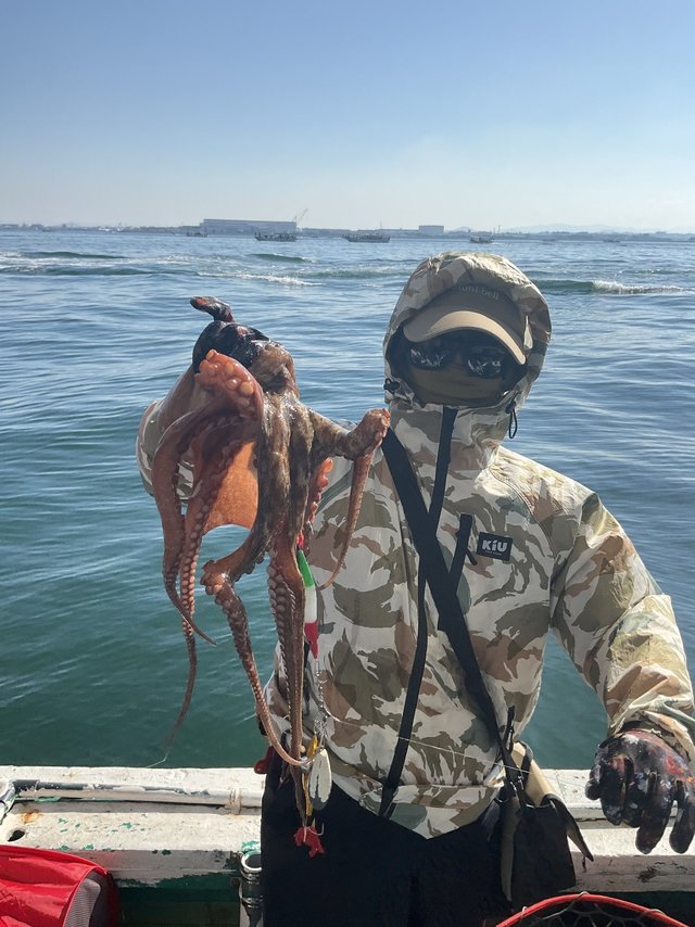 (マダコ)竿頭8匹 タコ便。 TOP8杯。 2番手5杯×3名様。 食べ頃サイズの中玉混じりのポロポロ拾い釣りスタートになりました。 中盤、潮の緩みと共に1㌔の大玉筆頭に中玉のパラパララッシュ突入。 重たそうに巻き巻きされているお客様の横でタモを持って待ち構えていると予想通りの大玉がお目見え。 パラパララッシュが続いてほしかったのですが、願い叶わずポロポロ拾い釣りに逆戻りとなりました。 海面近くでフックアウトした瞬間、1.6㌔の大玉タモキャッチ成功! ナイスキャッチのお声をいただきありがとうございました。 小玉が減り数は厳しくなってきましたが、中玉大玉が増えてきた様に思います。