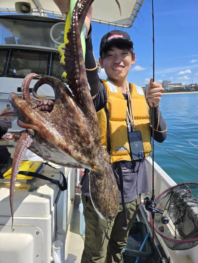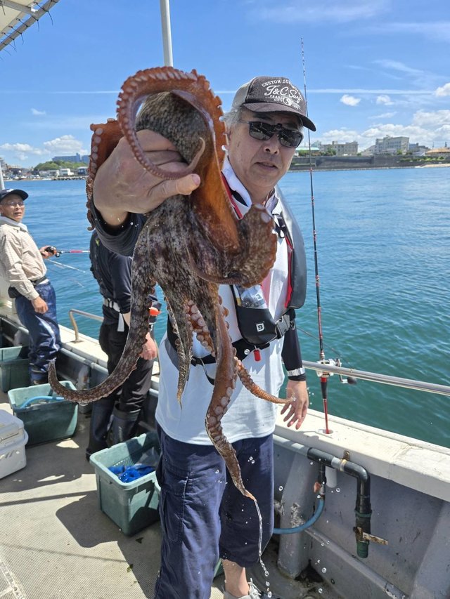 (マダコ)中潮。 小タコ、中タコが多い中、キロ超も多数釣れました。 最大で2キロ超。 数が少し伸び悩みますが、ボリュームのあるタコがよく釣れます。 是非キロ超狙いで遊びに来て下さい。 8月2日(土)→まだ空きあります。