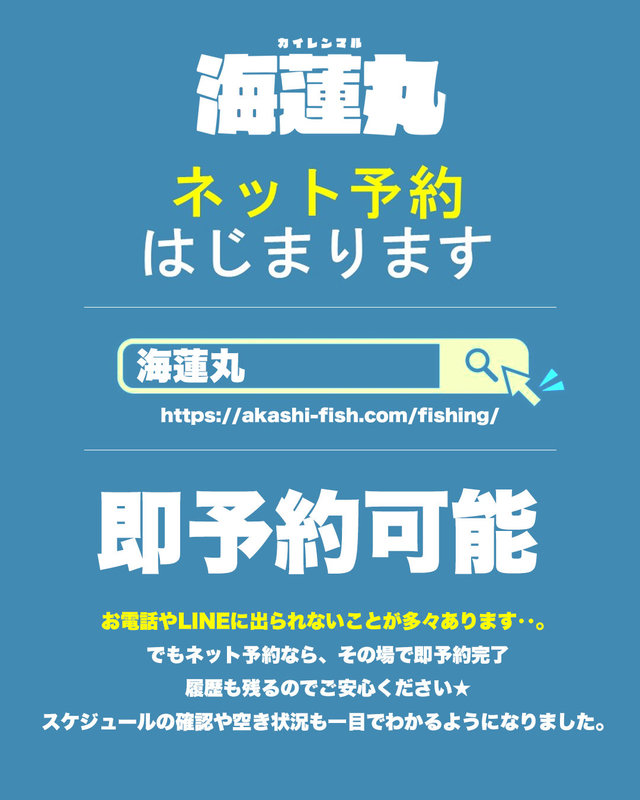 (マダコ)10~90cm 0~100匹 9月からスタート・遂に【ネット予約始まります】 「海蓮丸公式ホームページ」のトップページからご予約いただけるようになりました。電話は出れない事が多いので、ネットかラインでご予約をオススメします。よろしくお願いいたします!