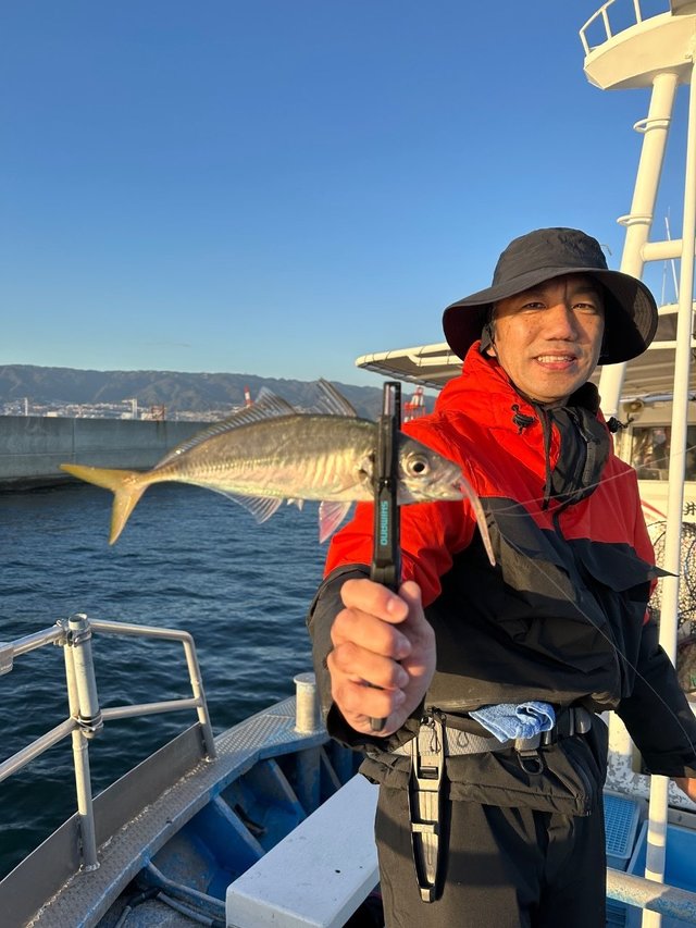 (マアジ)竿頭30匹 中潮。 ご乗船いただいた皆様、お疲れ様でございます。 <アジ午後便> ◾️バチコン◾️ TOP中アジ25匹。 ◾️サビキ◾️ TOP中アジ約30匹✖️3名様。 秋晴れポカポカ、気持ちいいベストコンディションになりました。 日中は着込むと暑いくらいですが、日が暮れると寒くなりますので防寒対策もご準備願います。 また個人生簀から水が流れるので、長靴や防水の靴等を履いてお越しください。 前半は魚探の反応も今ひとつ、船上は静まり返っていましたが、時間が経つと20㌢後半の良型中アジに尺アジが混じりポロポロと釣れていました。 その後は小アジ、カタクチイワシ、サバに邪魔されつつも中アジがよく釣れていました。