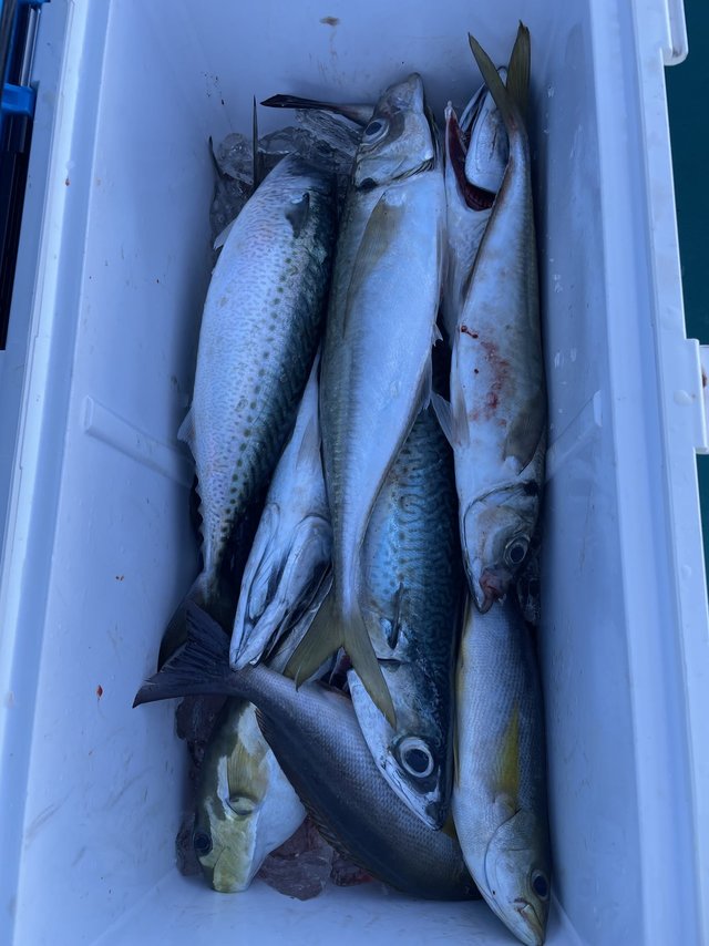 マアジ メイチダイ ブリ 最大96cm 五目釣り出船しました、久々に天気良かったですマアジ、メイチダイ、真鯛、96cmのブリなど色々釣れました9時までの釣果です、お疲れ様でした!