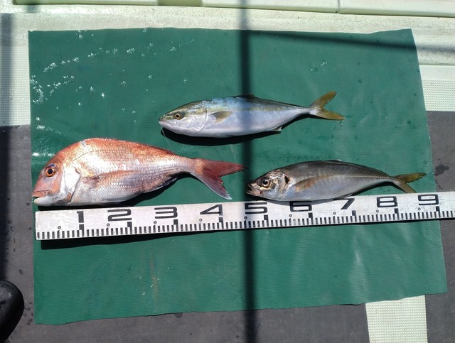 (ブリ)40cm 合計1匹 マダイ 46cm 合計1匹 マアジ 43cm 合計1匹 今日も風が強く、道具の扱い辛かったが、1尾ずつてはあるが、真鯛と真アジの良型が揚がった!(^_^;)