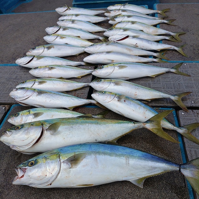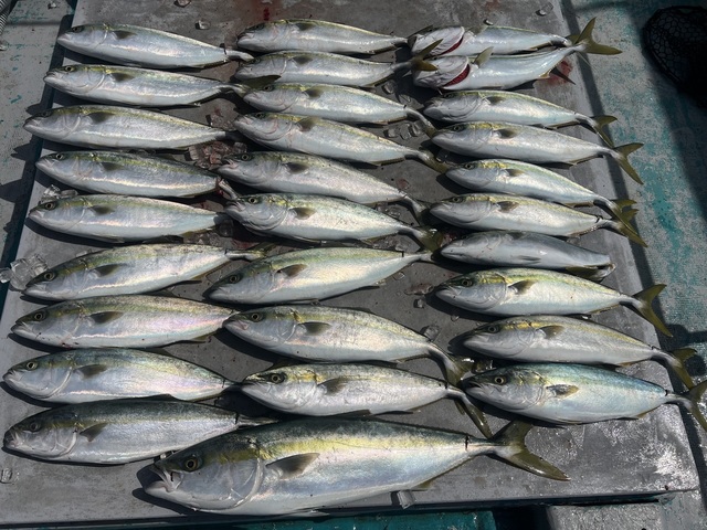 (ブリ)70cm 合計1匹 ハマチ(ブリ) 45~54cm 合計30匹 青物狙いでした。 風波あっても釣りしたい方のみで出船しました。 朝はザブザブで風裏へ移動。 ポロポロ釣れてお土産確保。 その後はボイルも出たり トップでもジギングでも バタバタとヒットしてくれました。 リリースもいっぱい フックアウト、ラインブレイクもあり 良型も混ざってますよ! ぜひこの機会にたくさん釣ってください! ご予約お待ちしております! 本日はありがとうございました! またお待ちしております!