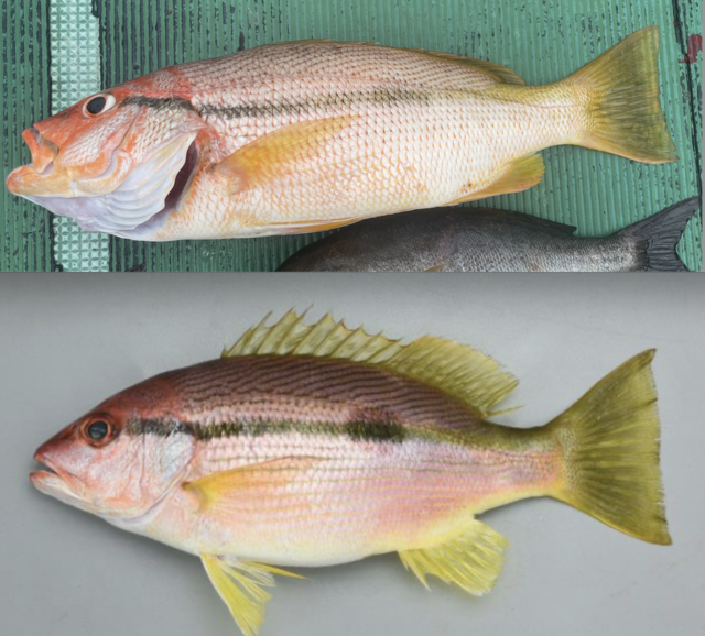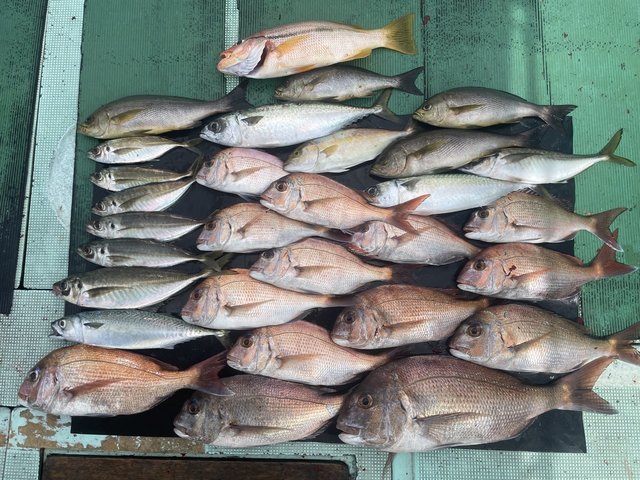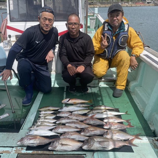 (カンパチ)33cm 合計1匹 マダイ 31~57cm 1~7匹 マサバ 39~42cm 合計3匹 マアジ 25~39cm 合計7匹 イサキ 32~39cm 合計4匹 タテフエダイ 44cm 合計1匹 ☆大気が不安定というその言葉通りの空模様になりました。南風が強くて一時は雨に降られました。 ★今朝は下り潮からのスタートです。朝マズメにアジとサバを釣っていただくことができました。 ☆その後は風が強くなり、雨にも降られ、コンディションは悪くなるばかりでしたが、まずはイサキを釣ってくれました。 ★その後、マダイがヒットするようになりました。はじめはチャリコでしたが、途中に良型が当たりました。 ☆合間にカンパチの幼魚であるシオの顔を見ることができました。 ★もう一匹、名前の知らない魚があがりました。帰ってから調べてみると、どうやら「タテフエダイ」という魚に似ているようです。確証はありませんが。 ☆生息地は沖縄と和歌山の串本とありました。本来はサンゴ礁のあるところに生息しているみたいです。これも温暖化の影響でしょうか。 ★本日は風と雨のなかどうもありがとうございました。