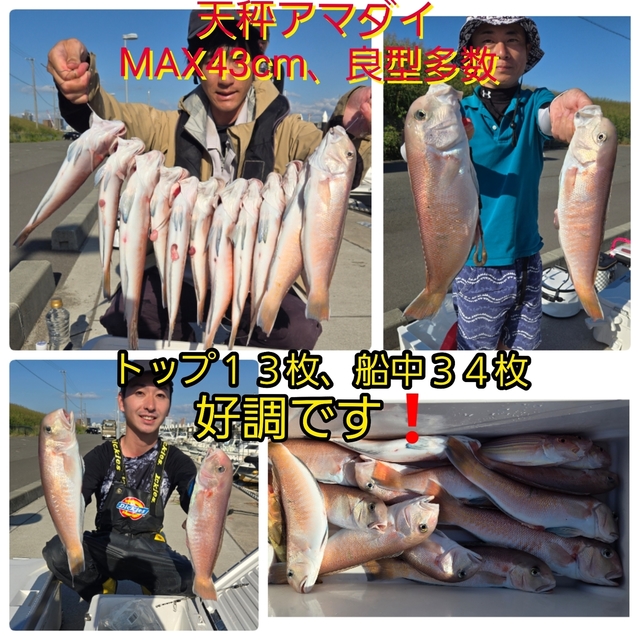 天秤アマダイ、誘導テンヤ 前半潮ほぼ動かず苦戦で 中盤からポツリポツリ 良型メインでサイズ良く トップ12枚、船中40枚でボチボチ 今日も誘導テンヤで掛けやすい時合いありました アマダイ乗り合い平日は空き多数ですので挑戦お待ちしています