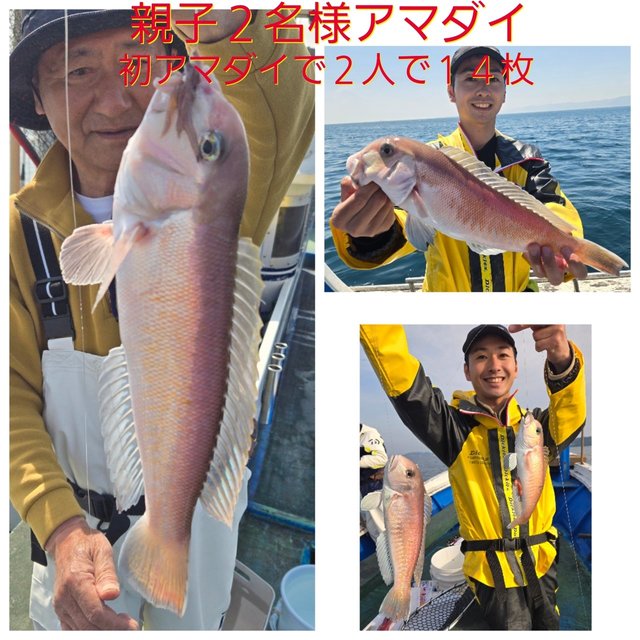 25~33cm 合計7匹 ハマチ 45~50cm 合計14匹 サバ 36~42cm 合計3匹 タイ 35cm 合計1匹 本日午前便は青物、アジ狙い、午後便はアマダイオンリーで出船しました。どちらも苦戦しましたがなんとか全員安打できて良かったです。ありがとうございました。また宜しくお願いします。