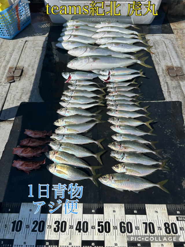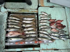 (マサバ)平均35cm 合計2匹 アジ 27~35cm 合計22匹 タイ 30cm 合計1匹 アジ27〜35cm22匹、 サバ35cm2匹、 タイ30cm1匹。