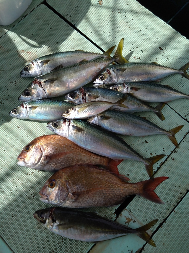 (マサバ)35~43cm 合計4匹 マダイ 30~50cm 合計3匹 マアジ 25~40cm 合計8匹 真鯛の50センチと30センチのダブルでのヒット!!…十分、引きを楽しめた\(^o^)