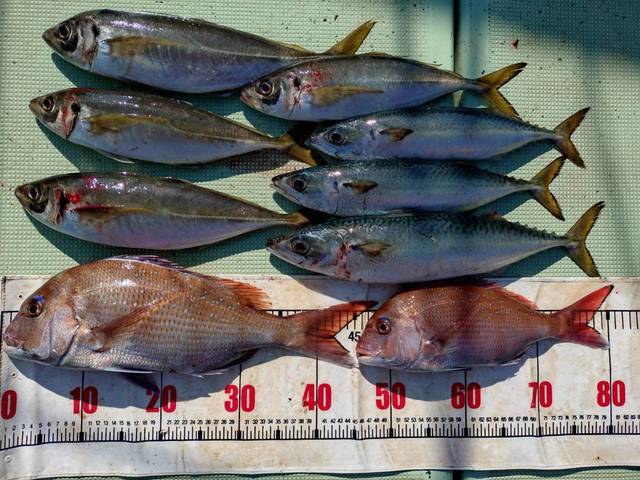 (マサバ)46~48cm 合計3匹 タイ 34~47cm 合計2匹 アジ 33~46cm 合計5匹 ありがとうございました!