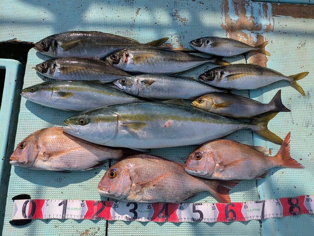 43cm 合計1匹 タイ 41~46cm 合計3匹 メジロ 71cm 合計1匹 ハマチ 46cm 合計1匹 イサギ 33cm 合計1匹 アジ 30~44cm 合計5匹 ありがとうございました!