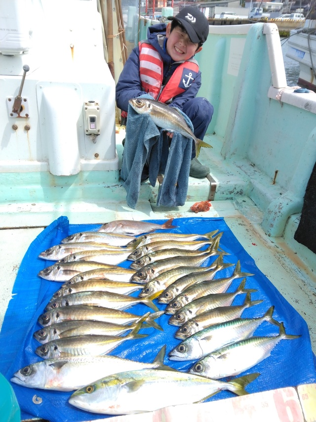 43~49cm 1~2匹 マアジ 41~48cm 1~3匹 ハマチ 51~53cm 1~1匹 チャリコ 30cm 合計1匹 本日はどうもありがとうございました。 ☆先日の南風で加太の周辺も桜が咲き始めました。でも今日は未明に小雨が降り、午前中は寒の戻りのような寒さでした。 ★今朝は上り潮からのスタートです。朝マズメにマアジとハマチを釣っていただくことができました。加太の釣りが初めてのお客様も見事48cmの鬼アジを釣ってくれました。 ☆その後にサバを狙いに行きましたが、きょうは魚影が全然浮いてきませんでした。それでもどうにか執念が実ってか、サバを釣っていただくことができました。今日のサバは中学生の男の子が釣ってくれた49cmが最長でした。お見事でした。 ★南風のときは蒸し暑いくらいの暖かさでしたが、きょうは一転して寒くなったので魚が頭を上げてこなかったのかもしれません。桜が咲いている間は天気の変化がホント目まぐるしいです。 ☆花見と一緒でぽかぽか陽気に当たればよいのですが、せっかく予定を立てても天気は思い通りにはいかないのが残念なところです。