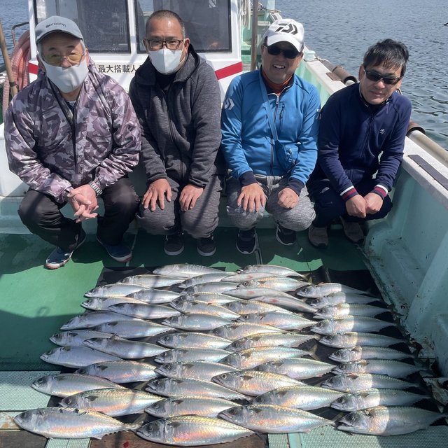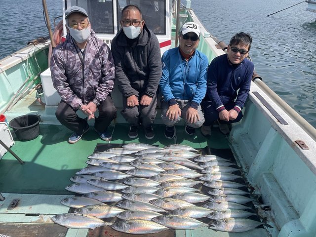 46~53cm 3~4匹 マダイ 43~44cm 1~2匹 マアジ 30~43cm 2~4匹 ハマチ 48~53cm 2~3匹 本日はどうもありがとうございました。 ☆今朝は南風が吹いていました。あまりに風が強いと出船と取りやめようと思っていましたが、早朝は心配していたほどではなかったので出船しました。とはいえ、天気予報どおり時間とともに風が強くなり、うねりも高くなってきたので、早帰りさせていただきました。 ★さて今朝は上り潮からのスタートです。朝マズメにハマチを、続いてマダイとマアジを釣っていただくことができました。 ☆その後、上り潮がゆったりしてきたタイミングでマサバを釣っていただくことができました。サバは丸太のように丸々と肥えおり、なかには50cmオーバーも当たりました。 ★ちなみに前日に船頭が釣ったサバは腹を開いてみると白子や卵が入っており、脂がのっていてとても美味しかったです。マダイは食べていないのでわかりません。