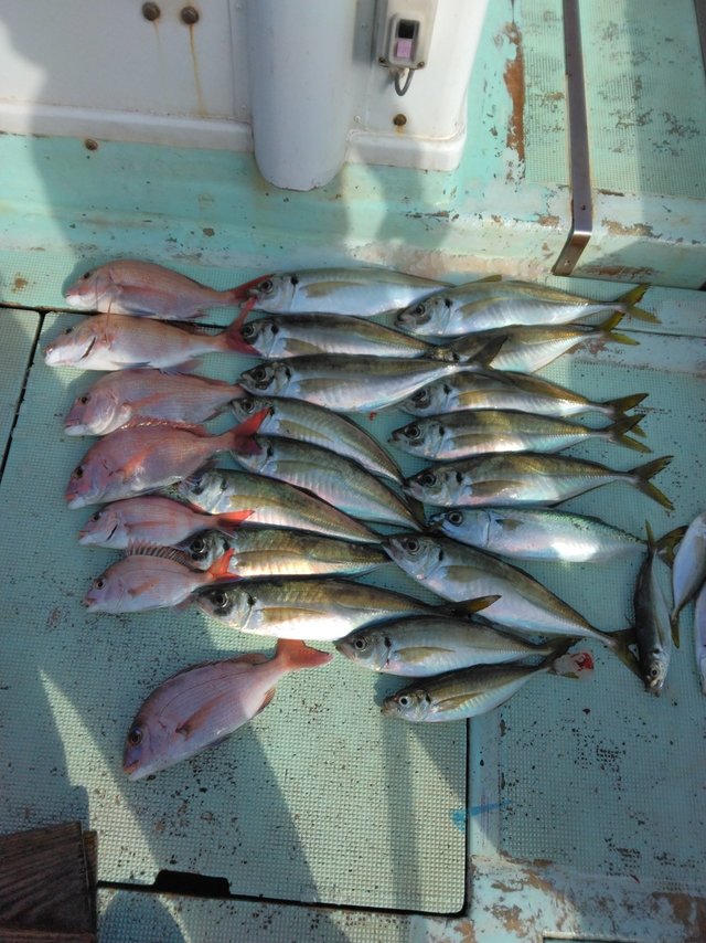 (マサバ)30~45cm 合計3匹 アジ 30~45cm 合計15匹 山口さん、アジ45cm前後5匹・ 30cm前後10匹、サバ30~45cm3匹、チャリコ、まじり。 他、岡崎さん サバ40~48cm6匹、 アジ45cm1匹、 43cm1匹、 23cm前後15匹、 チャリコ、まじり。