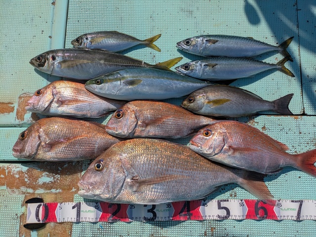 36~37cm 合計2匹 タイ 39~58cm 合計5匹 イサギ 34cm 合計1匹 ハマチ 49cm 合計1匹 アジ 29~46cm 合計2匹 ありがとうございました!