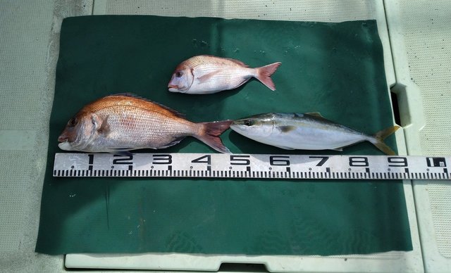30cm 合計1匹 マダイ 40~50cm 合計3匹 ツバス 40~45cm 合計10匹 朝の9時までヒットも無く…それ以降、ツバスのヒットか続いた。 真鯛を諦めかけた時、真鯛2尾一度にヒット!!結果的には、満足な釣果となった\(^o^)/