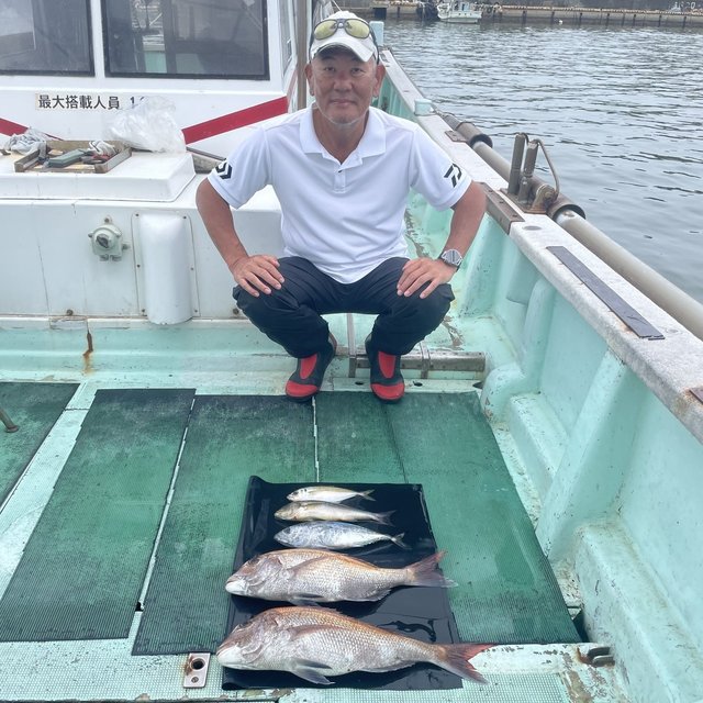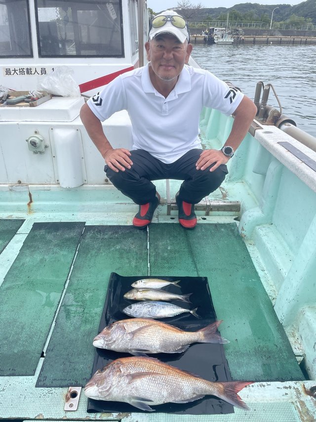 (クロマグロ)35cm 合計1匹 マダイ 55~59cm 合計2匹 イサキ 34cm 合計1匹 ☆避暑地に来たみたいに涼しく快適な季節になりました。 ★今朝は上り潮からのスタートです。朝マズメは魚影が映っていましたが、全然ヒットしませんでした。 ☆そのうち潮が荒れだして早朝から我慢の釣りになりました。 ★しばらく経って潮が落ち着いてきたところでお客様が大きく竿を曲げてヒットされました。 ☆魚影を見ると底の方にしか映っていなかったので、てっきりサバだろうと思っていましたが、トントンと叩くようなタイ独特の引き方をして、あがってきたのは55cmの見事な良型でした。次の流しには59cmの立派な良型があがりました。 ★チャンスはそれで終わってしまいましたが、2匹とも申し分のないサイズです。よく諦めずに頑張ってくれました。我慢の甲斐がありました。 ☆本日はどうもありがとうございました。