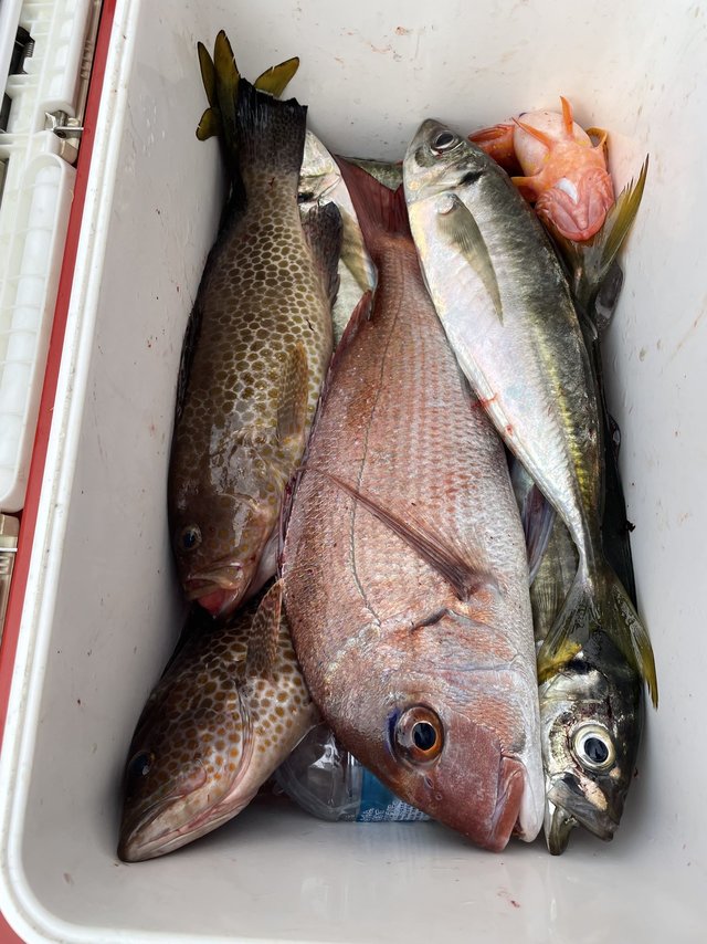 (スマ)マダイ 最大50cm マアジ サバ オオモンハタ 朝は凪でしたがだんだん風吹いてきました。 50センチマダイ、タイとアジ、オオモンハタのダブルなど。 今日はエサ取り少なかったです。