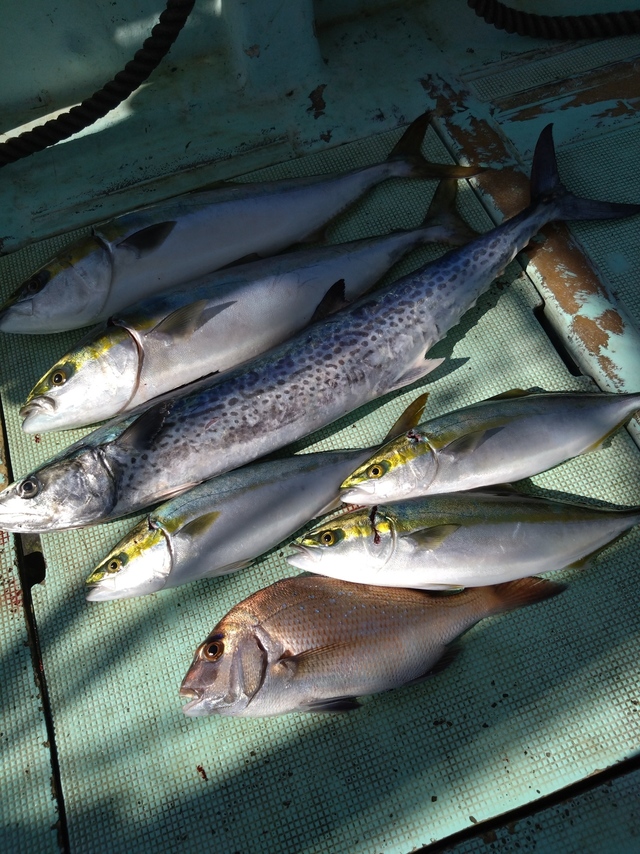 (サワラ)56cm 合計1匹 タイ 37cm 合計1匹 ハマチ 49cm 合計1匹 イサギ 39cm 合計1匹 アジ 26~28cm 合計5匹 ありがとうございました!