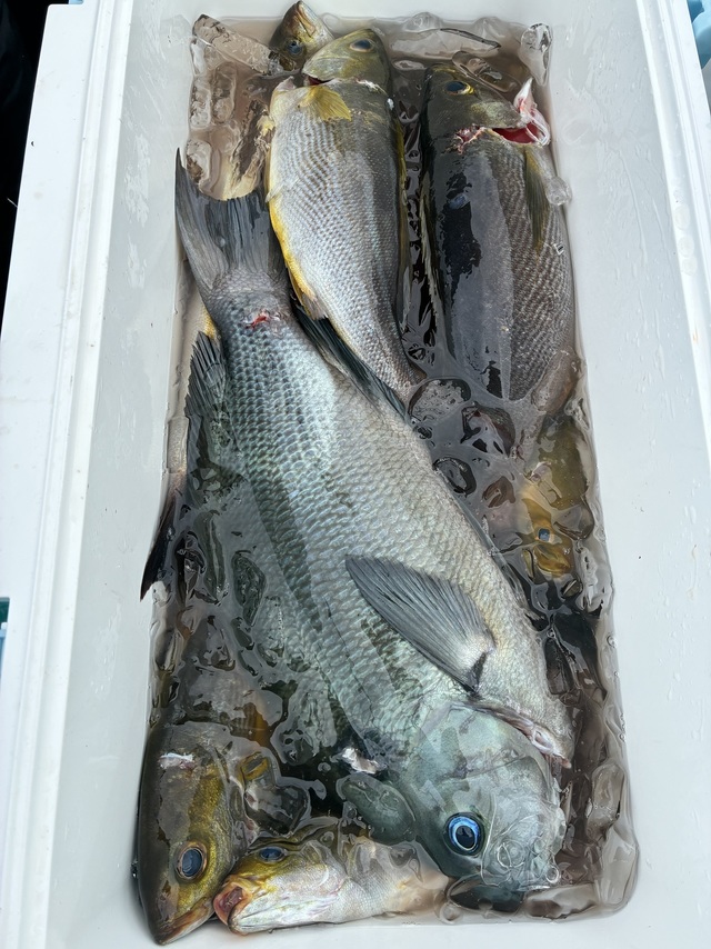 31~35cm 合計9匹 マダイ 35cm 合計1匹 シオ 46cm 合計1匹 グレ 35~41cm 合計3匹 オオモンハタ 36~48cm 合計3匹 オキアミ釣りに出船しました! 今日も喰い渋めでしたがポイント移動しながらポロッとアタリありでした。 真鯛にシオ、メイチダイにグレにオオモンハタにイサギなど釣れました! 本日14日は悪天候な為出船中止としました。 16日より通常通り出船予定です! 16~20日までどの日も現在少人数で空いてます。 21日も空きあります。 オキアミ釣り! ご予約受付中です。 気軽にお問い合わせ下さいm(__)m