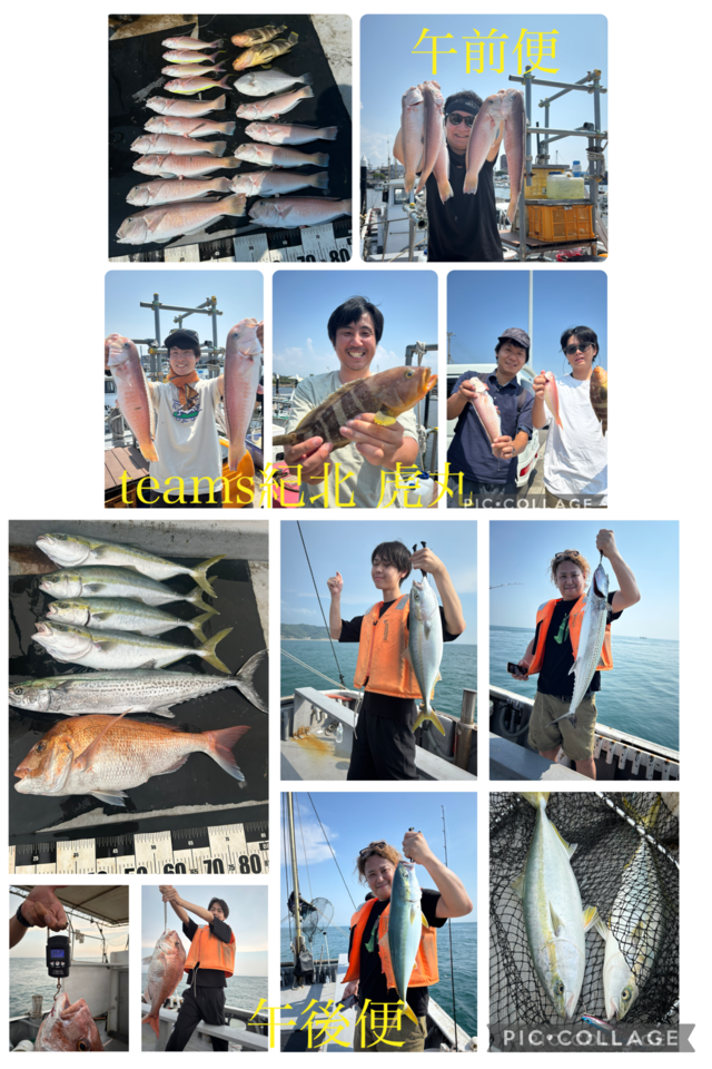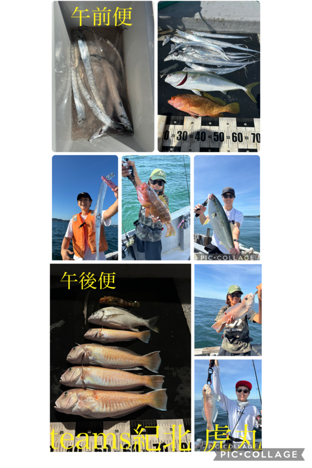 40~45cm 合計2匹 サワラ 80~100cm 合計3匹 キジハタ 42cm 合計1匹 ホウボウ 45~50cm 合計5匹 メジロ 60cm 合計1匹 マダイ 40~50cm 合計3匹 マトウダイ 42~44cm 合計2匹 アジ 30~45cm 合計12匹 マサバ 40~45cm 合計30匹 レンコダイ 30~45cm 合計6匹 遠征便でした。 豪華メンバーでワイワイと 楽しんで頂きました! 出船前から飲み会始まり、、、笑 到着すぐバタバタヒットあり すぐ止まり、、、 あちらこちらを転々と拾い釣り。 途中マグロのボイルもあり ヒットもありましたが 惜しくもラインブレイクでしたが 大盛り上がり! その後も拾い釣りしながら 走ってるとミニボイルに なーーんか良い反応、、、 まさかの良型アジサバ入れ食い! 釣り分けされてる方も居ましたね! 猛暑でしたが皆さん最後まで しゃくり倒して魚種豊富に 色々キャッチできて良かったです! 遠征便楽しめてます! ぜひご予約お待ちしております! 本日はありがとうございました! またお待ちしております!
