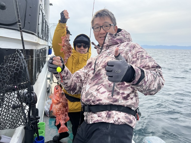 30~40cm 合計6匹 マダイ 65cm 合計1匹 遠征便でした。 朝少し波残っていたので 浅場で遊んで 深場へ大物狙いに行きました。 反応あるもののなかなか 本命出ずでエソの猛攻でした。 潮が入ると同時に反応も弾けて 良型のウッカリカサゴや大鯛が 連続ヒット! こらもろたで!!と思った時 まさかの大雨、、、、。 みんなボトボトで寒過ぎるので 途中断念。早上がりしました。 また天気のいい日にリベンジお待ちしております。 本日はありがとうございました。