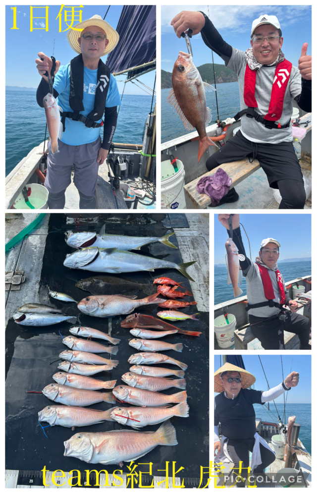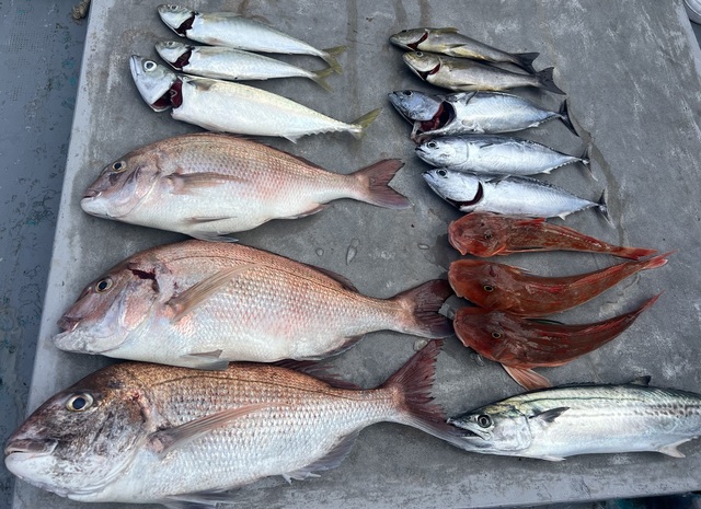 40~45cm 合計3匹 マダイ 55~60cm 合計3匹 ソウダガツオ 40~45cm 合計3匹 サゴシ 60cm 合計1匹 サバ 47cm 合計1匹 落とし込み便。 濁り?雨?の影響なのか ベイト散ってしまい苦戦でした。 ジギングでホウボウ、サバ、ソウダカツオ 落とし込みでタイ、イサキ、サゴシ等 魚種は豊富でしたが 当たり少なめでした。 ラストに連発でなんとか 色々キャッチしていただけました。 天気回復すれば良くなっていくと思います。 本日はありがとうございました! またお待ちしております!