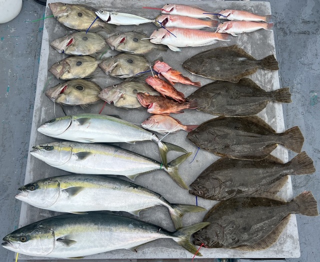 40~47cm 合計7匹 ヒラメ 50~60cm 合計5匹 ブリ 80~81cm 合計2匹 メジロ 70~75cm 合計2匹 シロアマダイ 30~47cm 合計5匹 落とし込み&甘鯛狙いでした。 落とし込みメインでまわりました。 ヒラメにブリにマトウダイ ポツリポツリ当たったり ボコボコ当たったり 全員安打して頂けました! ベイトもたっぷりで 落とし込み楽しめてます!!! ぜひご予約お待ちしております!! 甘鯛は短時間でしたが ポロッと釣れてジャンボも見れました! 本日はありがとうございました! またお待ちしております!