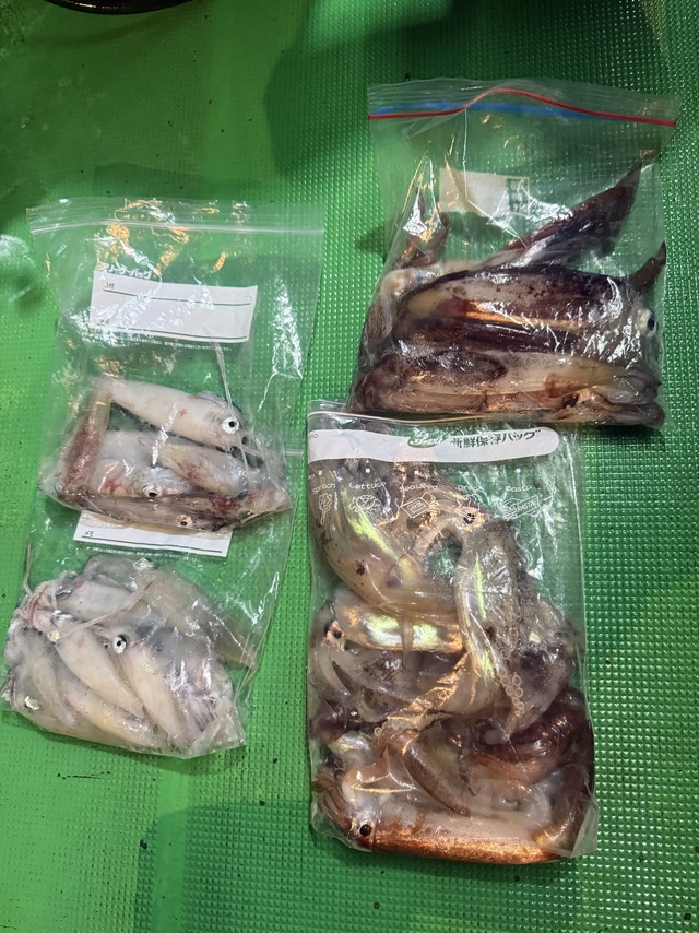 (スルメイカ)アカイカ 凪でした。 イカメタルデビューおめでとうございます。 ちょっと活性悪かったですね。 アカイカ、スルメでトップは20匹でした。