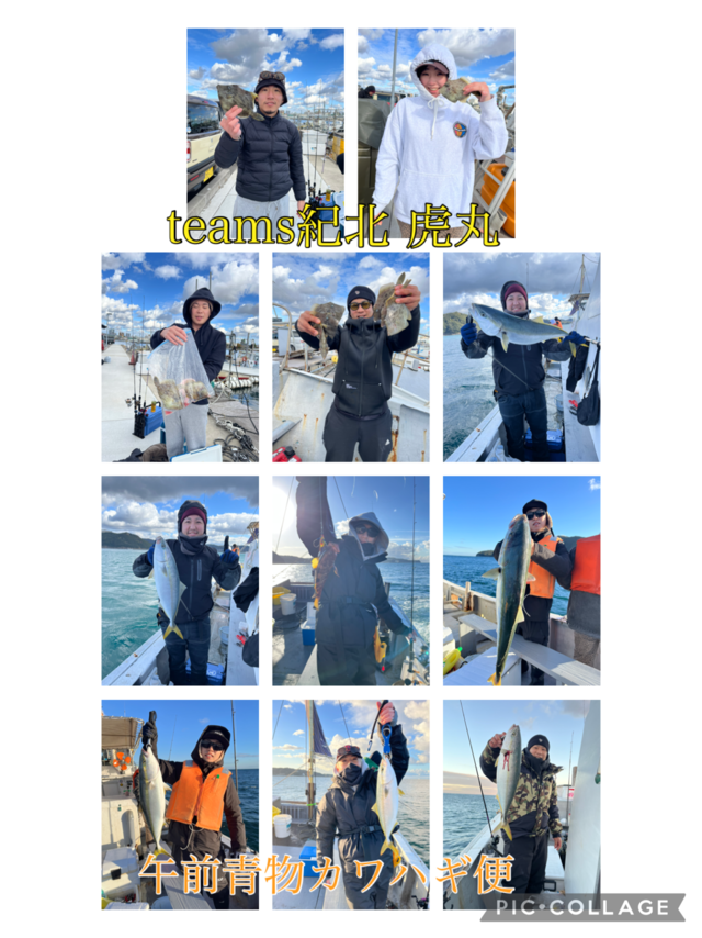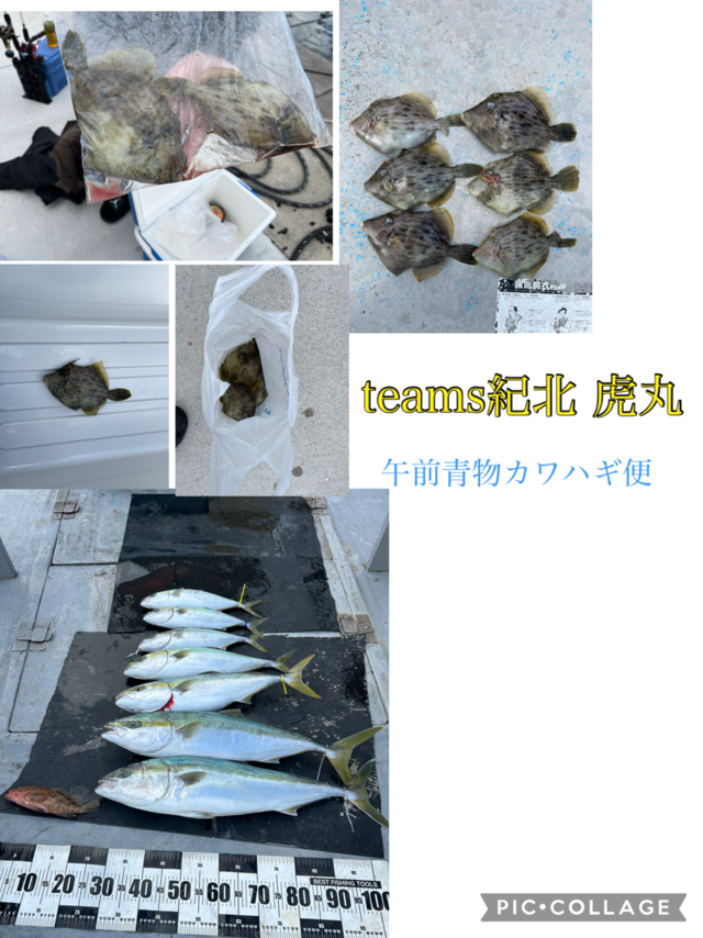 45cm 合計1匹 メジロ 65~76cm 合計11匹 ハマチ 50~55cm 合計25匹 スズキ 55cm 合計1匹 ハス 20~26cm 合計5匹 カワハギ 17~20cm 合計9匹 本日ノマセでメジロゲット、ジグでハマチ入れ食い。カワハギは短時間でハス多めでカワハギはサイズ小さく撃沈。波風強い中頑張って頂きありがとうございました。また宜しくお願いします。
