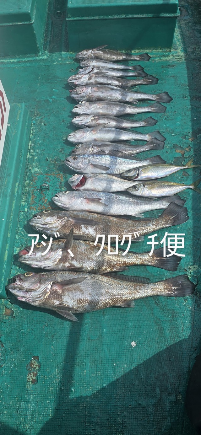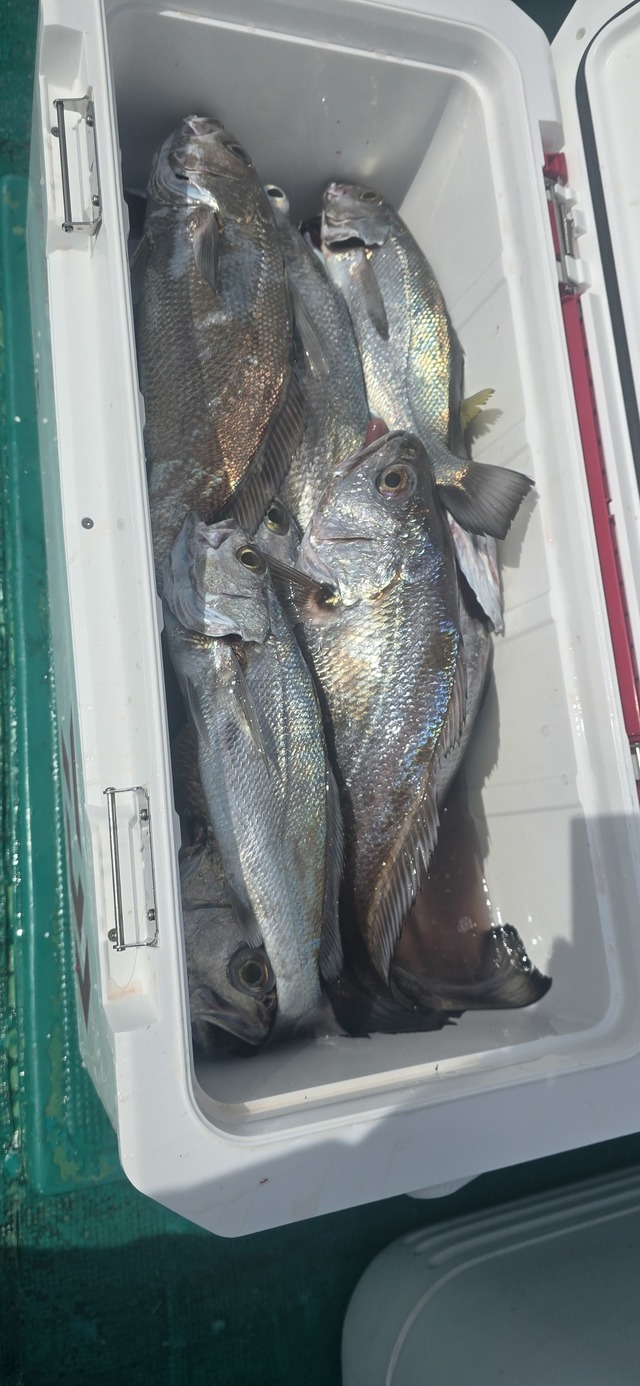 30~55cm 1~2匹 シロアマダイ 25~30cm 0~1匹 ハモ 85cm 合計1匹 マゴチ 30cm 合計1匹 朝から前日のウネリが残っており、朝から厳しかったですが、一瞬ウネリがマシになったタイミングで、ポツポツ釣れMAX55cmのクログチが釣れました。そのあと風向きが変わり、急遽アマダイへ変更し、何とかシロアマダイ2匹とコチが釣れ、満足して頂けました。是非次回もお待ちしております。