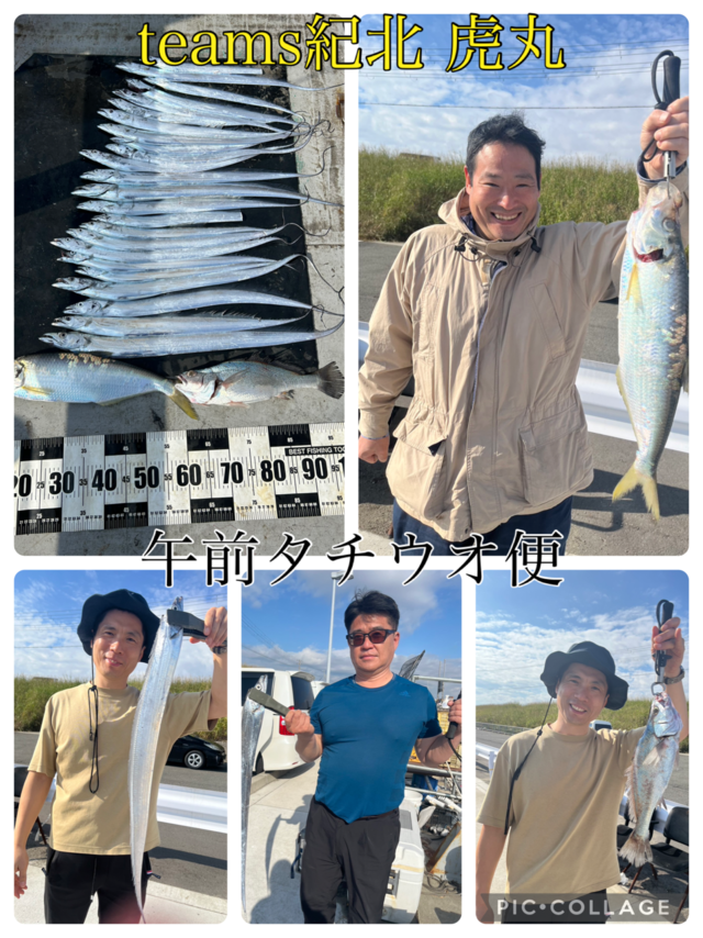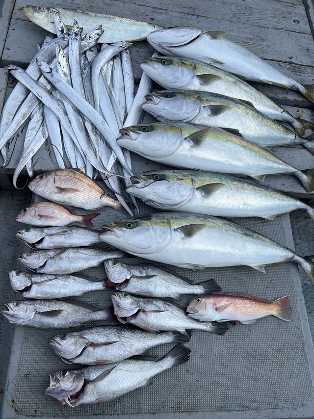 38~45cm 合計8匹 ブリ 82~87cm 合計6匹 タチウオ 70~90cm 合計20匹 マダイ 30~42cm 合計2匹 シロアマダイ 40cm 合計1匹 色々便でした。 まずは太刀魚へ。 バタバタとヒットしてくれて サイズも良型出てくれました。 クログチも混じり楽しめました。 青物は鰤が連発! 毎流しヒットあり連発もありました! 鰤好調です!!! タイラバは少し風が出てきてやりにくく 急遽甘鯛狙ってみようとのことで やってみました。 なかなか当たりなかったですが ラストに1発キャッチでした。 厳しい日が続いていましたが かなり回復してくれて楽しめました! 本日はありがとうございました! またお待ちしております!