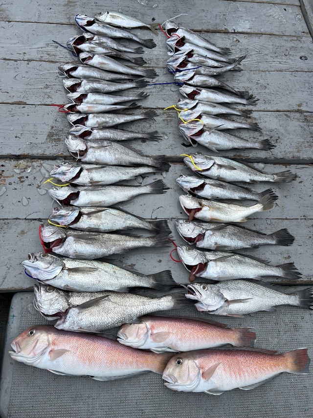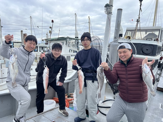クログチ&タイラバでした。 クログチは初挑戦の方ばかりでしたが 皆さん上手くコツを掴んで頂き コンスタントに釣りあげてくれました。 全員安打したのでサイズ狙いへ。 こちらでもコンスタントに釣ってくださり 良型も釣れてくれました。 タイラバは風に負けてしまい 上手く流れずだったので急遽 最後は甘鯛狙いへ。 良型ばかり連続ヒット&キャッチ。 たくさんお土産ゲットで終了となりました。 太刀魚が難しくなってきたので 潮待ちにクログチ狙いも良いですね! 脂も乗ってて美味しいですよ! ぜひご予約お待ちしております! 本日はありがとうございました! またお待ちしております!