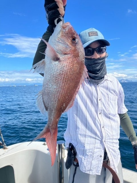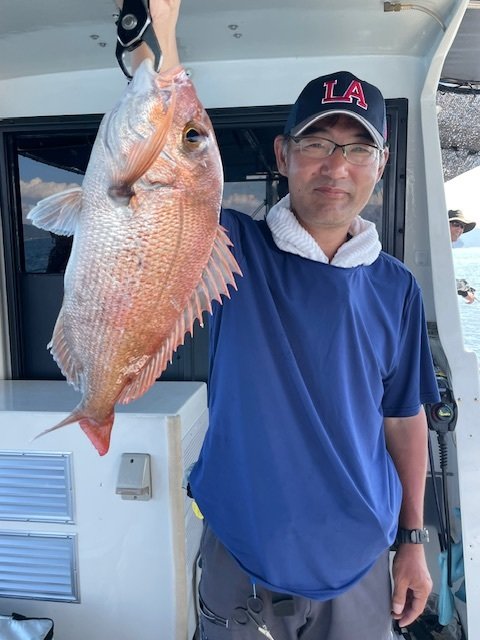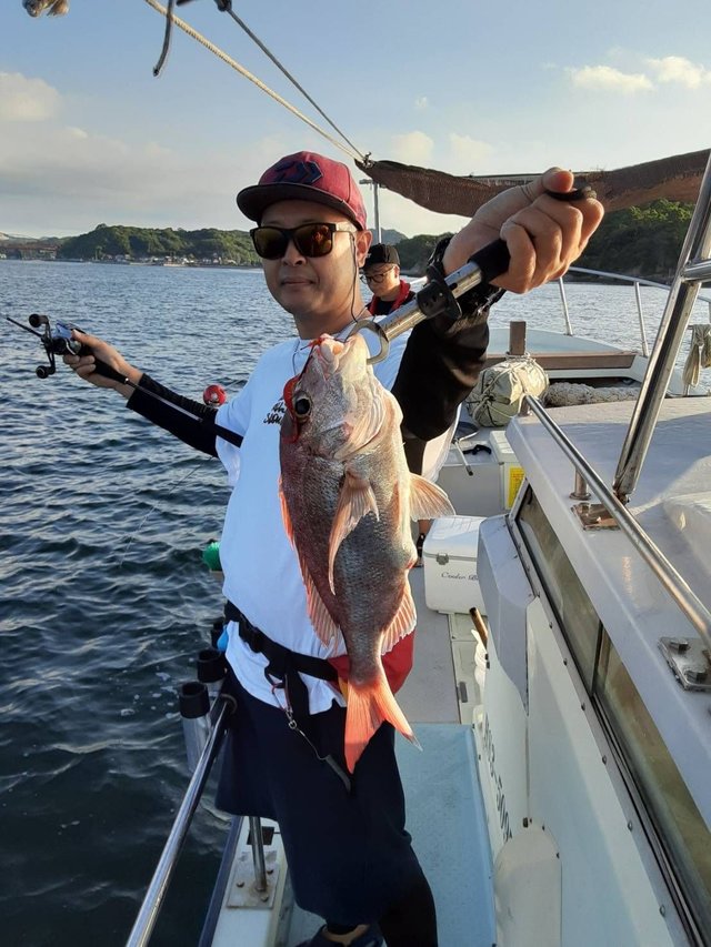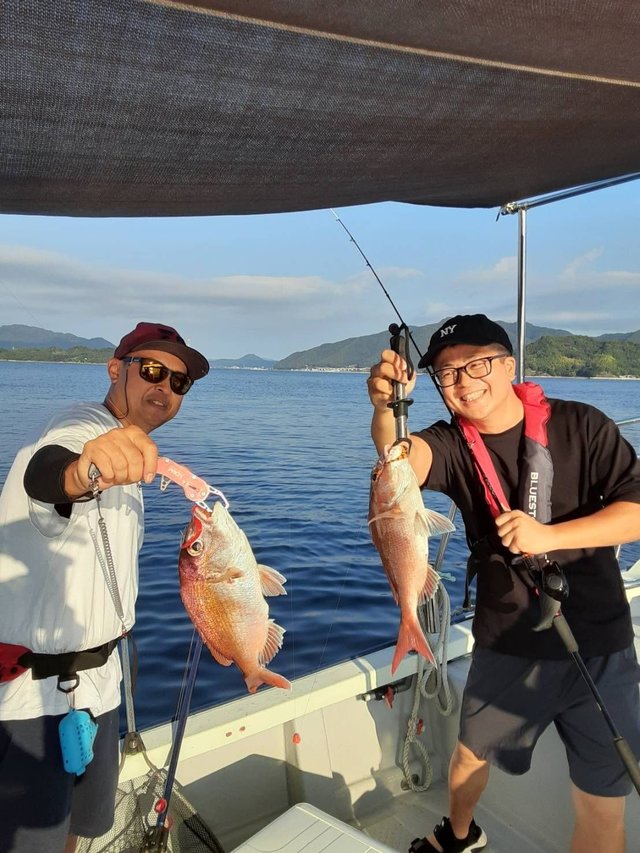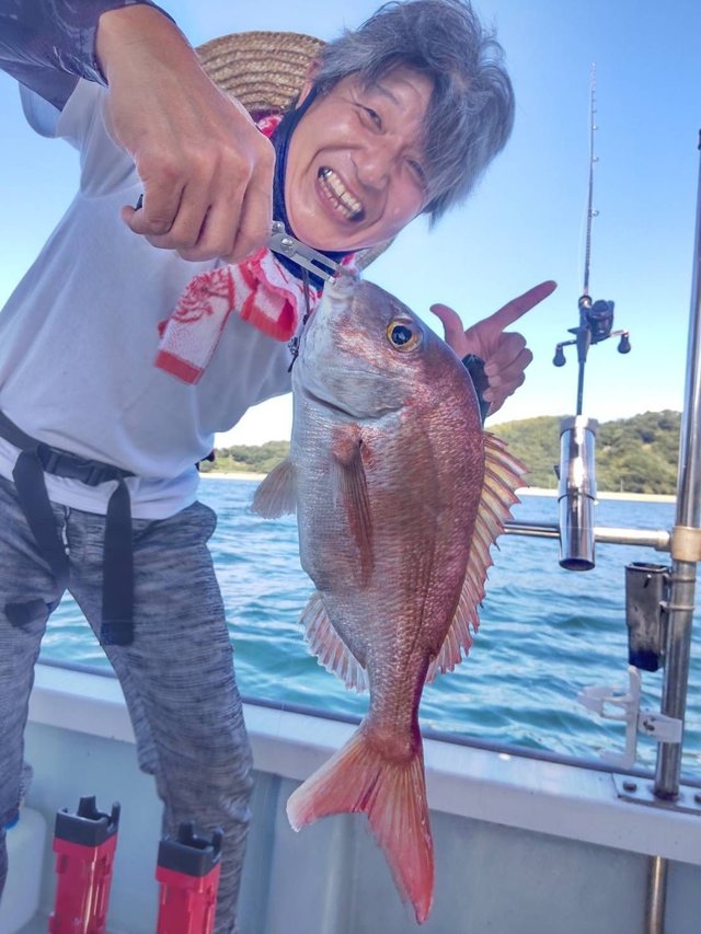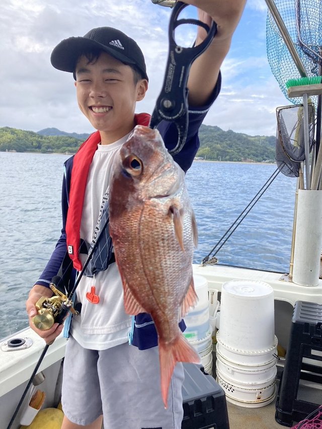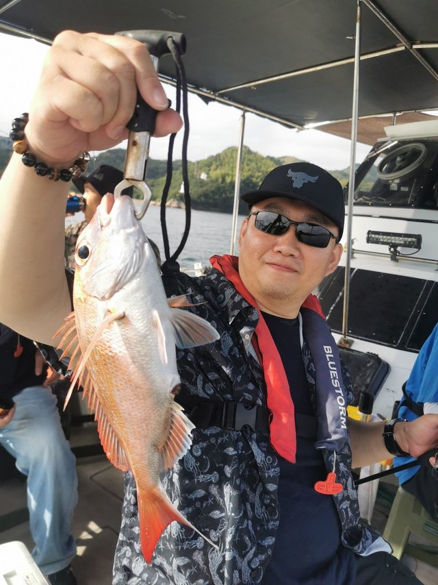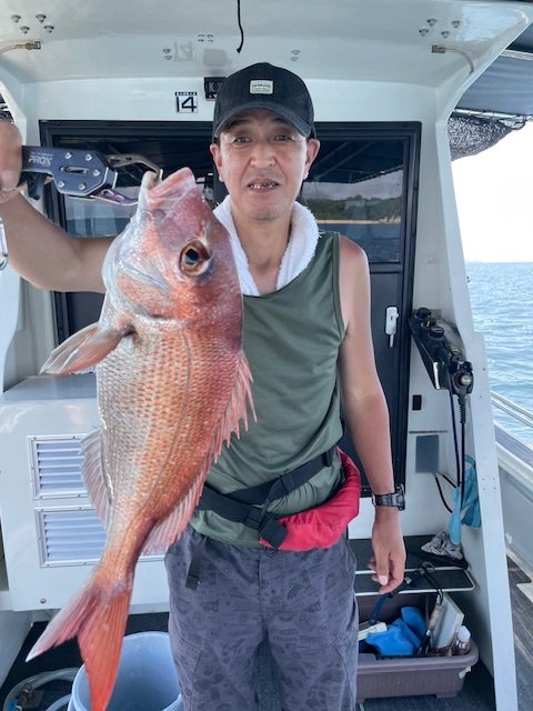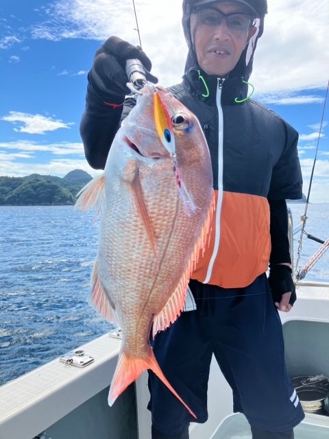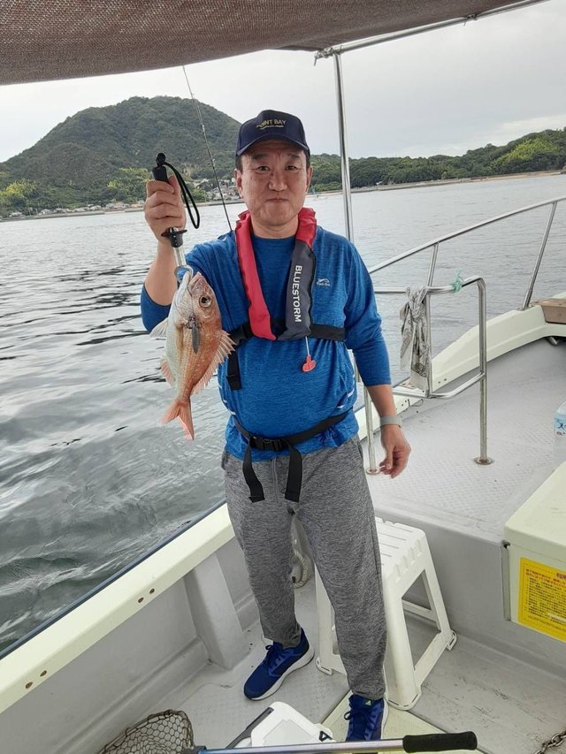 ①海正丸。 どんどん暑くなっているため、少し早めの出航。朝一、アコウがポツポツと。タイはご機嫌。。。なんとかタイもゲット!またのご乗船お待ちしております。