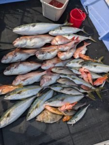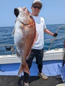 マダイ 最大76cm ブリ この日はバスプロ御一行の方と釣り初心者とそうでない方(笑)をお連れしてキャスティング&ジギング&タイラバ&SLJのワガママ便! 正直キャスティングはもう時期外れでさすがにしんどいか…と思いきや、意外となんとか成立?しました笑。 しかしまぁ釣るよね〜。 おかげで開始数時間でクーラーパンパン&船長クタクタに…笑。 76cmの鯛でおっしゃー!ってなってたら、すぐに81cmの鯛を釣られて王者奪還…。 なんせ終始ワチャワチャ盛り上がってました笑。 帰りにオマケでイサキSLJを少しだけ。 潮が気に入らないのかかなりテクニカルな釣りになり、上手にパターン掴んだ方は顔を見れる…みたいな展開に。 どの道クーラーにはもうスペース無いので、SLJの可能性だけを感じてもらって帰港…笑。 皆さん楽しんでもらえたみたいで良かったです。