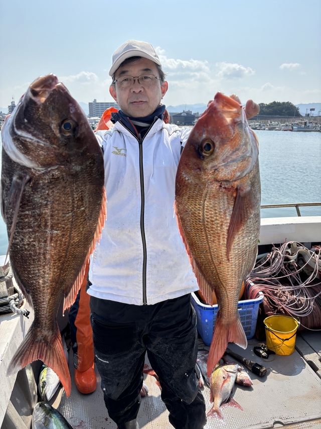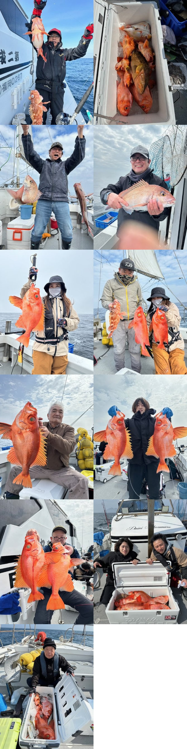 20~40cm 5~16匹 彼岸鯛爆釣!大漁!朝の1流し目から真鯛が、船上を賑あわせました♪今日はあたり途切れる事なく、納竿まで、よく釣れ、釣る人16枚10枚以上が8名様いました。全体でも100枚超えの大漁となり最盛期の彼岸鯛釣りまだまだ楽しめそうです。