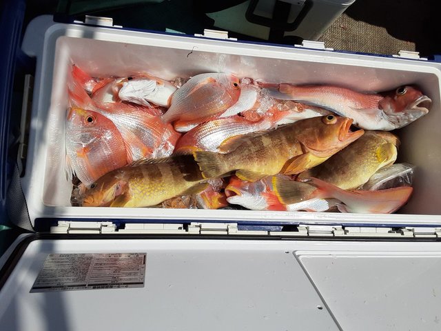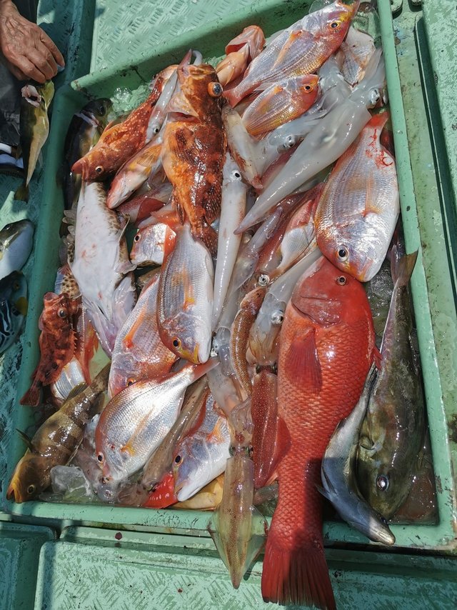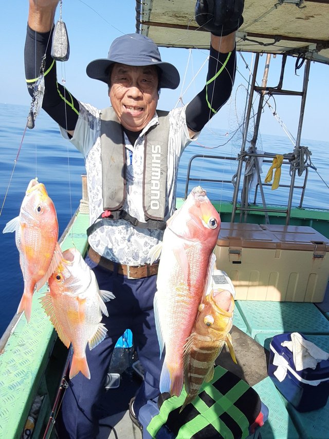 (キダイ)25~30cm 合計160匹 アマダイ 45~50cm 合計4匹 アオナ 30~50cm 合計35匹 タカバ 25~35cm 合計10匹 アラカブ 25~40cm 合計15匹 イトヨリ 30~40cm 合計10匹 久しぶりに凪になったので沖のポイントに行きまあまあ釣れた。