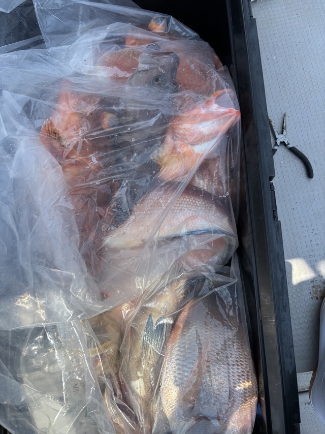 (アカアマダイ)50~55cm 合計2匹 アラカブ 25~45cm 合計25匹 チカメキントキ 25~35cm 合計8匹 アオナ 25~45cm 合計12匹 レンコ 25~30cm 合計80匹 タカバ 25~30cm 合計6匹 今日はレンコの食いが良くなかった。