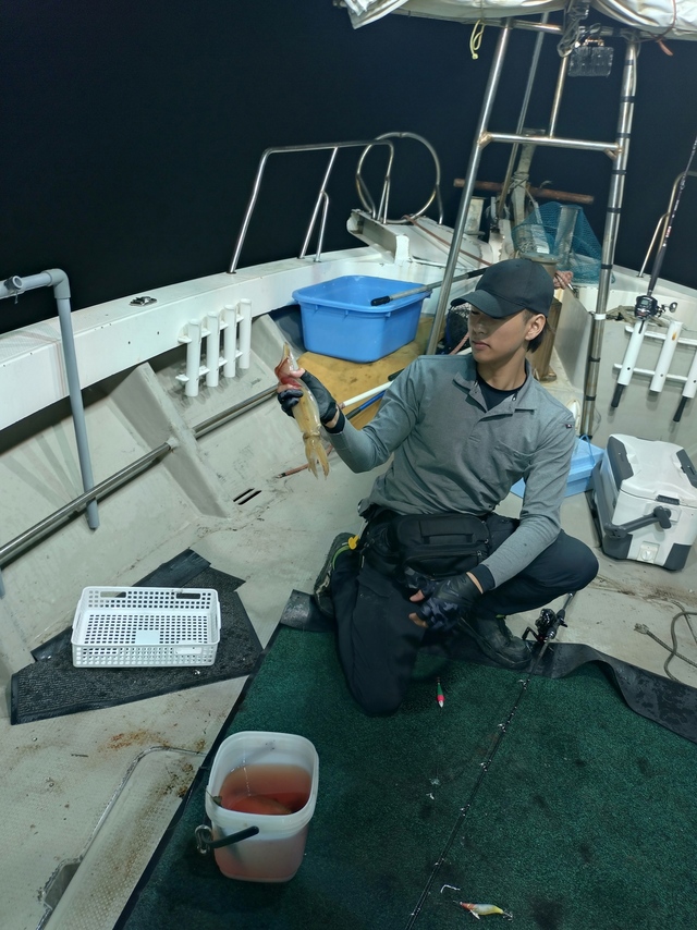 ケンサキイカ 本日もイカ釣りで出港してきました。 日が暮れてすぐは小ぶりなイカが多かったのですが、21時頃から状況が変化! スルメイカを中心に、ぽつぽつと釣果が伸び始めました。 釣果としては、一人あたり10〜20匹ほどゲットされた方が多かったです! 形の良い「夏イカ」(ケンサキイカ)も、一人1〜2匹ほど。 前回の釣行と比べても、全体の状況は少しずつ上向いてきた感じです!