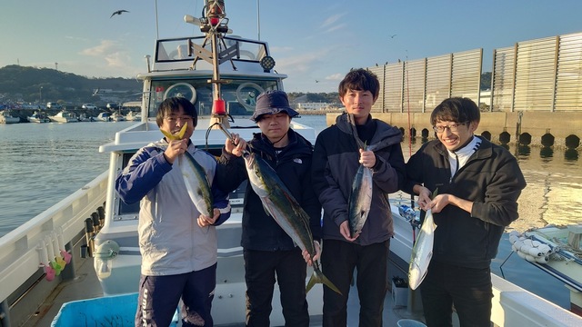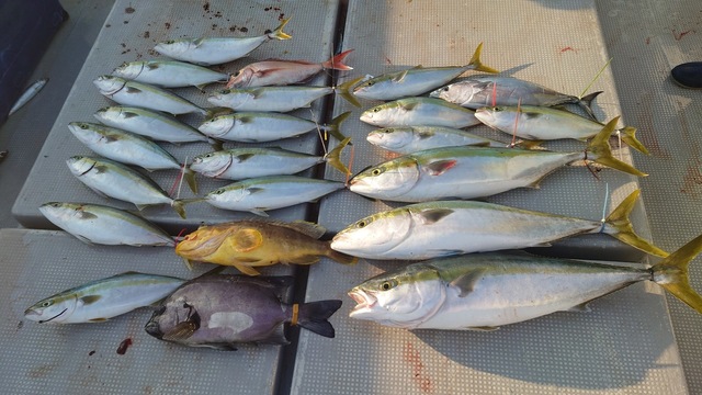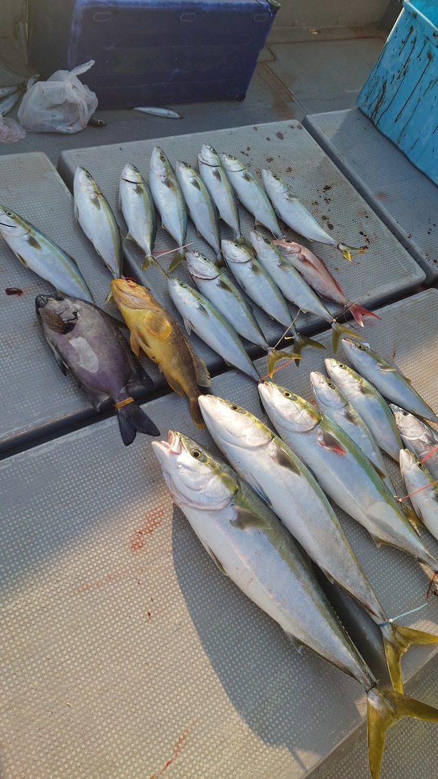 (ブリ)3.70~4.90kg 1~3匹 ヒラマサ 5.70~7.20kg 1~1匹 ヒラメ 2.10~3.70kg 1~1匹 マダイ 36~47cm 1~1匹 ご乗船いただいた皆様、お疲れ様でした! ?今日は潮が動き出すタイミングで、狙い通り大型のベイトの群れに遭遇 仕掛けを投入するとすぐにアタリがあり、竿が絞り込ま れる豪快なファイトを堪能していただけました ?特に、この時期ならではの脂の乗ったヤズの引きは格別でしたね 今日もヒラマサ7キロオーバー、ヤズ、ヒラメ等が