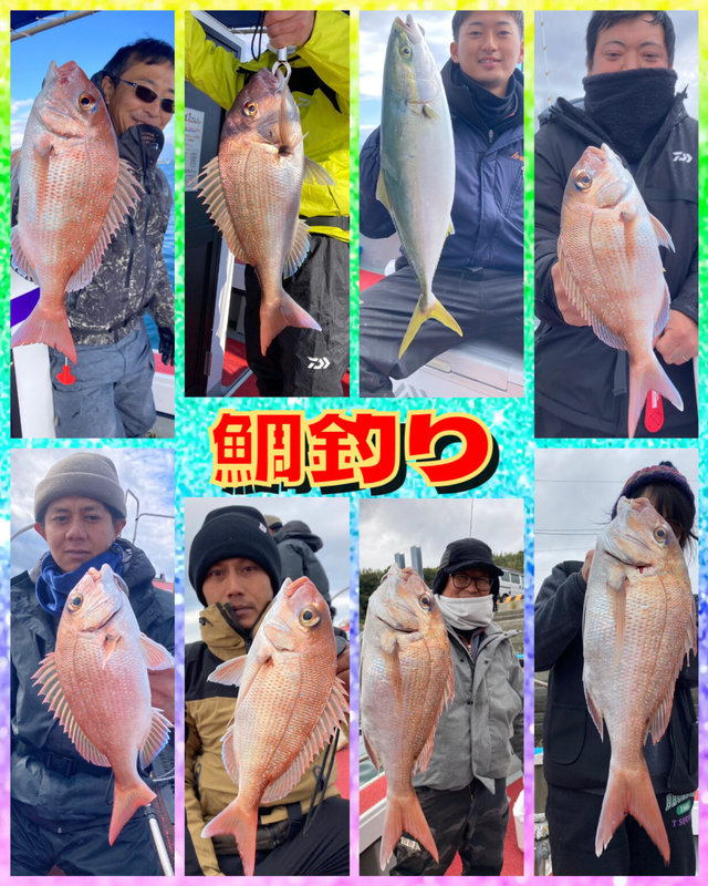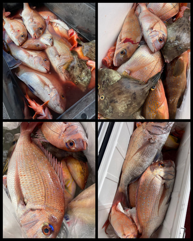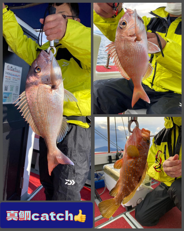マダイ オオモンハタ コチ 鯛釣り便。この日は風予報。まんまと予報に騙されました。風予報で攻めたいポイントを我慢して他のポイントに入るも『チーン』全く風なくベタ凪。大移動〜。ポイント着くとあたり多く潮が緩むまではいい感じ〜。やはり餌があたるでも小ぶりが多い。常連様が70UPをキャッチ。良型もいる。色々と仕掛けチェンジされてのキャッチ。バラシもあり悔しい思いをされての1枚!お見事でした。テンヤが良かったりラバが良かったりジグが良かったりと、その日の真鯛が食べたい仕掛けをセッティングされてチャレンジしてみてください。釣果UPにつながると思います。御乗船ありがとうございました。今後とも宜しくお願いいたします。