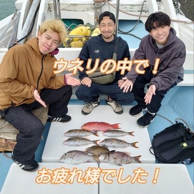 アカハタ シロダイ この日は、前日の時化のウネリが残り風も少し強い感じ! 港口を出るとやはりウネリがキツい! そこで今回は、南よりのポイントに入り釣行開始! それでもウネリが入り、始めは当たりの見極めも難しく、初心者あるあるですがウネリでの竿の曲がりに当たりと勘違いしてしまい即合わせ! ですが、コツを掴むと魚の当たりを見極め徐々にヒット連発!本命ポイントには、全く入れませんでしたがそれでも引きの強いタキベラやシロダイ等も出てくれ、少しは釣りの楽しさも味わって頂けたかなと思います。 海況的には厳しい状況でしたので、又、ご機会が御座いましたら凪の海でもっと釣りの楽しさを味わって頂きたいと思います
