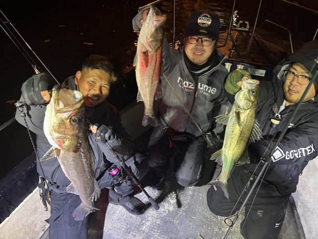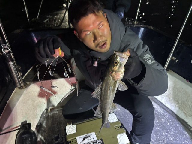 (スズキ)15~55cm 合計4匹 ヒラスズキ 30cm 合計1匹 マサバ 20~25cm 合計2匹 クロダイ 47cm 合計1匹 Night&DAYチャーター2号艇石井ちゃん 本日は深夜に急遽ご予約をいただき、そのまま沖からレッツゴー! さっきまでベタ凪だったのに、急に風が出てきてユラユラ…。まずは近場を軽くチェックしてみましたが、反応がイマイチだったので南下してポイント移動。 南側ではポツポツとバイトはあるものの、なかなか乗り切らず苦戦。 最近調子の良かったポイントですが、やっぱり“そのタイミング”が存在する感じですね。 その後も明暗を転々としながら探っていくと、魚は居るのに口を使わない…。 そんな中で顔を出したのはまさかの黒鯛! 夜が明け始めた頃、ようやく反応が良くなってきて、なんとかシーバスをキャッチ!ヒラスズキも混ざってくれました。 明るくなってからさらにポイントを変えて反応を追うと…まさかのサバ登場(笑) ミッドナイト便は全体的に難しい状況でしたが、最終的に魚の姿が見れてホッとひと安心。 ご乗船ありがとうございました!