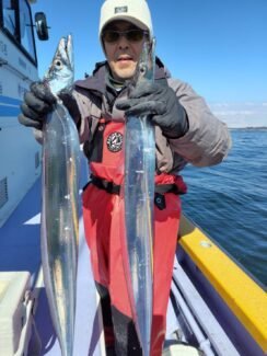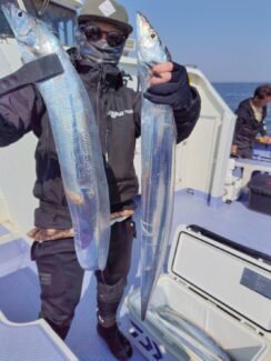 シーバス 36~80cm 0~2匹 午前シーバス。 前回良かったポイントから始めましたがアタリ無く苦戦。 その後も転々と移動するもセイゴばかりとサイズアップできず… 最後のポイントでは余計なアタリ無いものの良型サイズ主体で追加できました。 ----- タチウオ。 70~105㎝、 テンビン0~4匹、 テンヤ1名1匹、 ルアー1名8匹。 羽田~川崎20~25m。 朝から転々と廻りましたがなかなかアタリで出ず苦戦しました。 終日アタリは少なくたまに釣れ型が見れる程度で厳しかったです。 残念ながら0匹の方は1名さまヒットしただけに惜しいところでした。 釣れれば90㎝クラスが多かったです。 竿頭はルアー・戸津さま、テンビン・深澤さま。