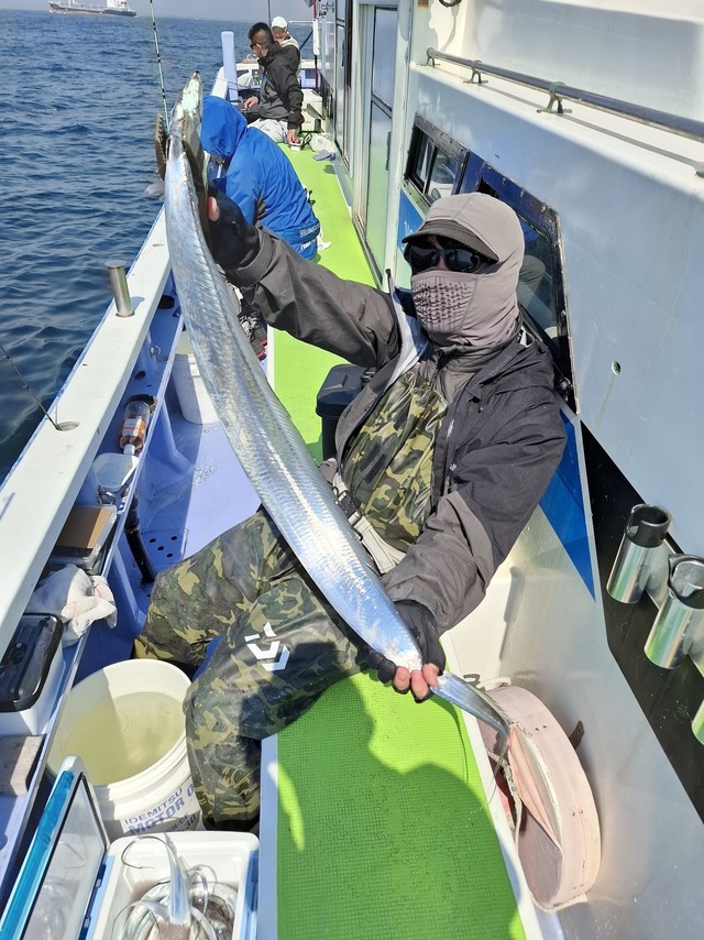 (タチウオ)85~95cm 1~3匹 本日はタチウオ船で出れました。 ありがとうございます。 本日は仕立て船。 最近は浅場なのでとりあえずポイントへ。 朝一反応ありすぐにルアーにヒット。 エサはなかなか難しそう。 でも面白いんですけどね。 その後も反応乗せるもなかなかヒットならず。 後半少しやる気が出たのかポツポツっとありました。 サワラもですけどタイミングですね。 ムズオモロいタチウオ。 チャレンジャーお待ちしてます.