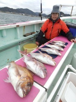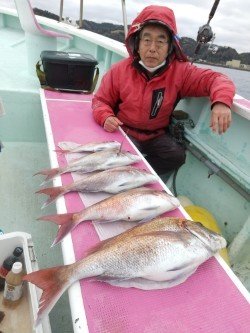 0.80~1.20kg 0~2匹 ワラサ 4.50~6.20kg 0~3匹 今日はシマノのカワハギ大会が有ったので、マダイ&ワラサ船で出船した。朝一番、勝山沖で間もなく当たりが有って1.0kgクラスのマダイが揚がった。 後が続かず場所替えしたが、此方もマダイの顔を見ただけで場所替え、保田沖へ移動した。 間もなく1.0kg弱のマダイが揚がったが、後が続かず場所替えの繰り返しになり、単発の拾い釣りになった。 10時過ぎに冨浦沖へ移動して、何回か場所替え。 終盤、ワラサの入れ食いになり良い人は5回当たって3匹ゲットしていた。大型のバラシも3回有って残念だったが楽しめました。 明日はマダ&ワラサイ船とイサキ&マアジのリレー船で出船確定両船共空きが多数で予約受付中です。(マアジ船も泳せ仕掛けを持参ください)