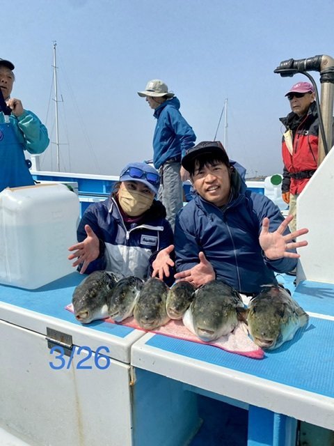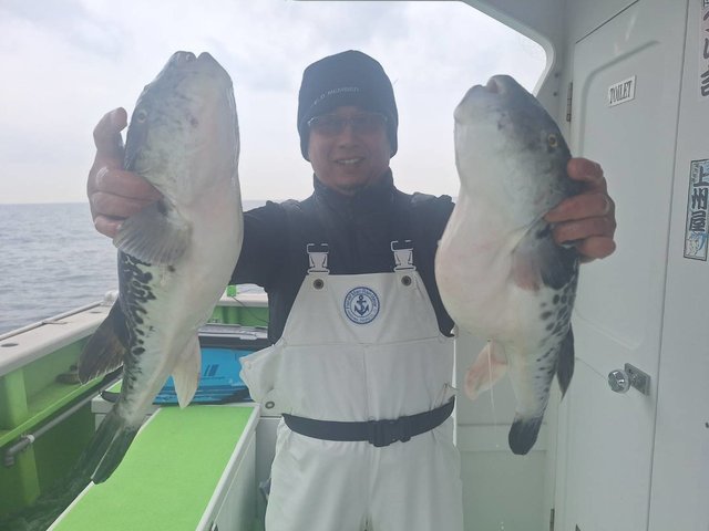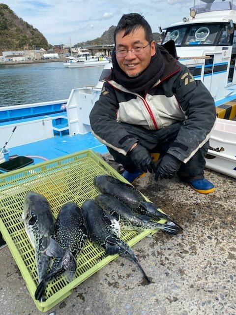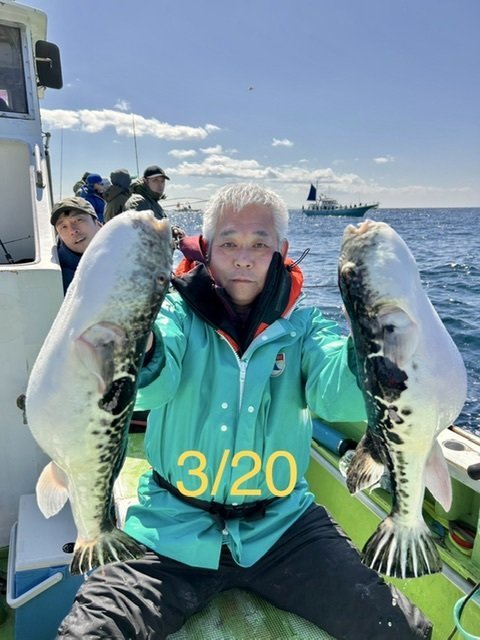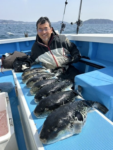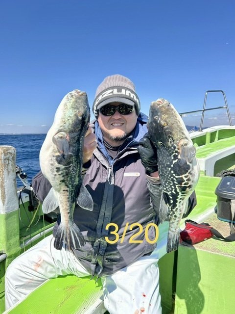 1.10~3.40kg 0~2匹 【午前トラフグ船】 反応は多めにあり、当たりもあるもののなかなか針掛かりせず少々苦戦しました。 サイズは良いものが多いです。 【トラフグ船の予約状況】 3/27~3/31、4/5、6、12、13日は満席となっております 平日は空席多数の日が多くありますのでお問い合わせください 満席日でもキャンセルが出た場合はHPにてお知らせいたします なお、4月からの出船時間は5時となりますので4時集合でお願いします ・エサのアルゼンチン赤エビ10尾付き(料金に含まれます) ・13~15時の間、フグの処理中につきお電話に出ることができない場合があります。時間を避けてお問い合わせいただけますようよろしくお願い致します