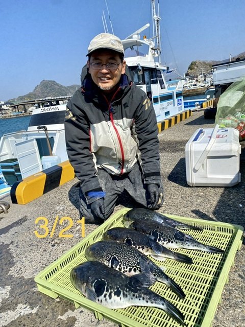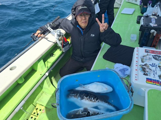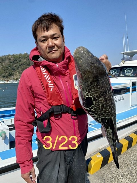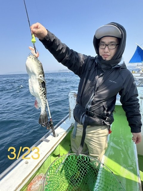 1.10~4.20kg 0~4匹 【午前トラフグ船】 バレもありますが当たりも良くあり、多い方は4匹釣れました!サイズも良いです。 当たりが少ない場合は仕掛け、エサ、誘い色々試してみてくださいね! 明日28日(金)は強風予報につき出船中止となります。ご了承ください。 3/29~3/31、4/5、6、12、13日は満席.平日は空席多数の日が多くありますのでお問い合わせください。 また、キャンセルや人数変更がある場合はなるべくお早めにご連絡ください。 4月からの出船時間は5時となりますので4時集合でお願いします 。 本日もありがとうございました!
